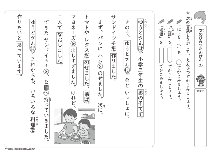 文のひみつたんけんプリント【モノクロ版】文のひみつたんけんプリント【モノクロ版】 「主語と述語」を文章の中から探す練習ができるプリントです。3年生以降のお子さんにおすすめです!文のひみつたんけんプリント【モノクロ版】