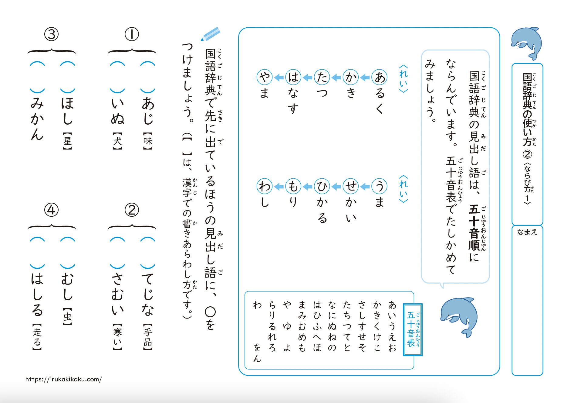 そこで、このプリントでは、ならび順や見出し語の形を、少しずつ練習できるようにしました。